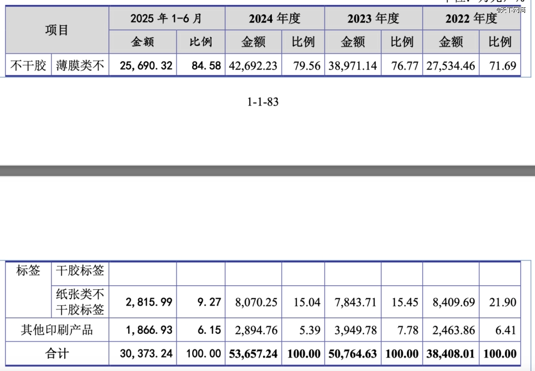 从招股书披露的业务结构看,公司主要营业业务聚焦薄膜类与纸张类不干胶标签两大品类,两类产品合计贡献超九成营收,是*的业绩支柱。其中,薄膜类不干胶标签以聚丙烯、聚乙烯等材料经加工涂布背胶制成,典型应用包括东方树叶瓶身的浮雕触感标签、蓝月亮洗衣液包装的耐水抗油标签,这类产品凭借功能性与美观度兼具的特点,成为公司营收主力。以2024 年为例,薄膜类不干胶标签营收达4.28亿元,占全年营收比例高达79.81%;纸张类不干胶标签则以铜版纸为主要基材,2024年营收7937.5万元,占比14.79%,两类产品共同构成公司业务基本盘。
