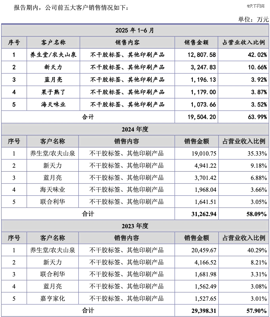 翻阅江天科技的财务报表,绑定消费巨头是最鲜明的印记。其中,养生堂及其控股的农夫山泉,是无可替代的营收压舱石:2022年至2025年上半年,农夫山泉为其带来的销售额分别达1.13亿元、2.05亿元、1.90亿元和1.28亿元,营收占比从29.40%持续攀升至42.02%。