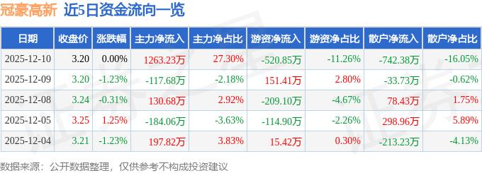 12月10日的资金流向数据方面,主力资金净流入1263.23万元,占总成交额27.3%,游资资金净流出520.85万元,占总成交额11.26%,散户资金净流出742.38万元,占总成交额16.05%。